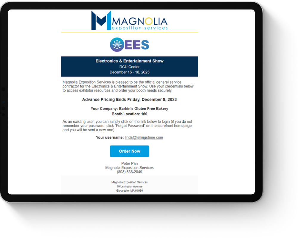 For each event, use Boomer’s e-mail campaigns to announce key dates and deadlines. Drive exhibitors to your storefront by sending links, generating logins and get them shopping. Campaigns can be used to let exhibitors know ordering is open, deadline dates are approaching, or even that you haven’t received an order from them yet.
